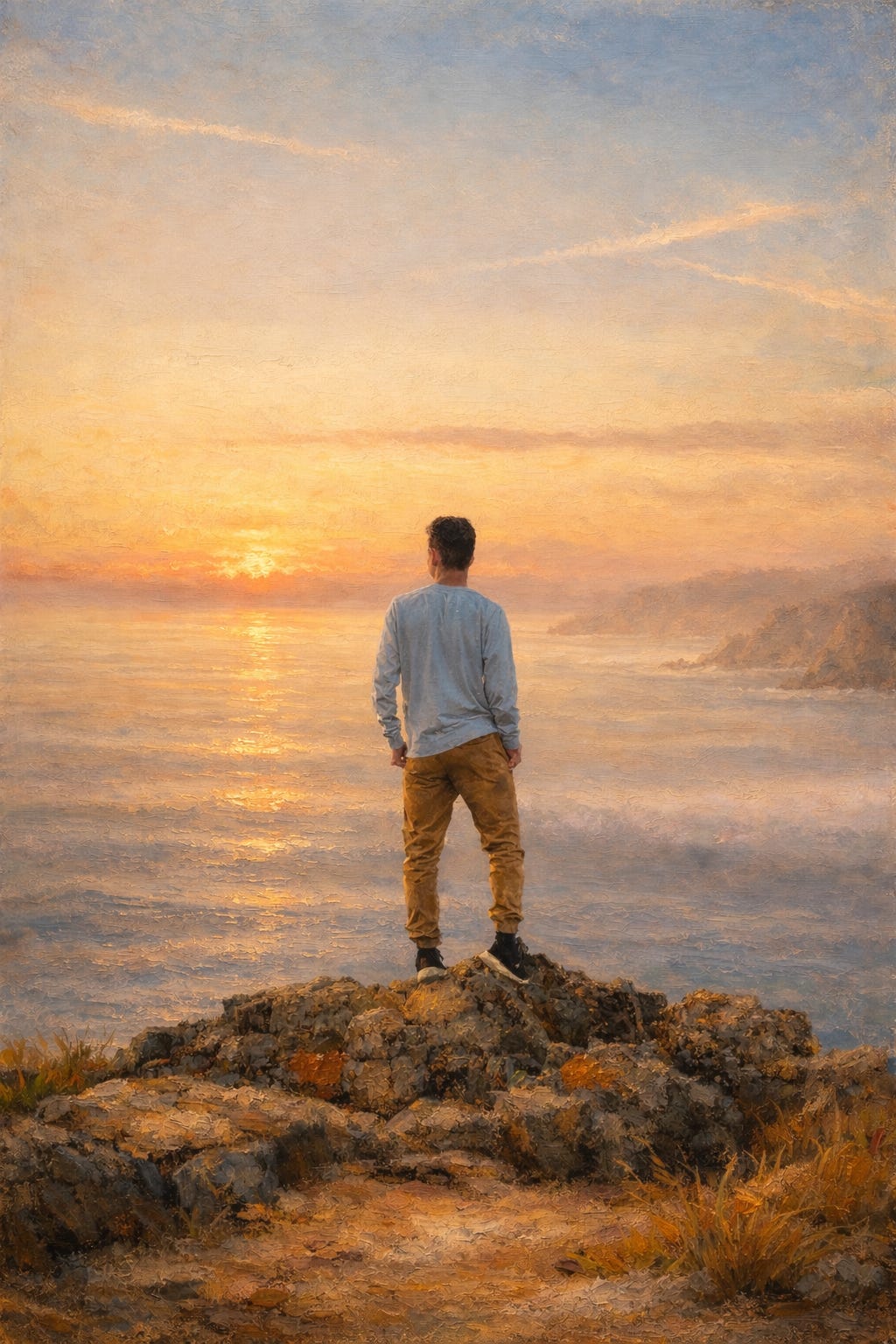 In this first painting, a solitary figure stands above the ocean as sunrise spreads across the horizon. The moment is expansive and contemplative, inviting the viewer into a space of stillness and reflection.
